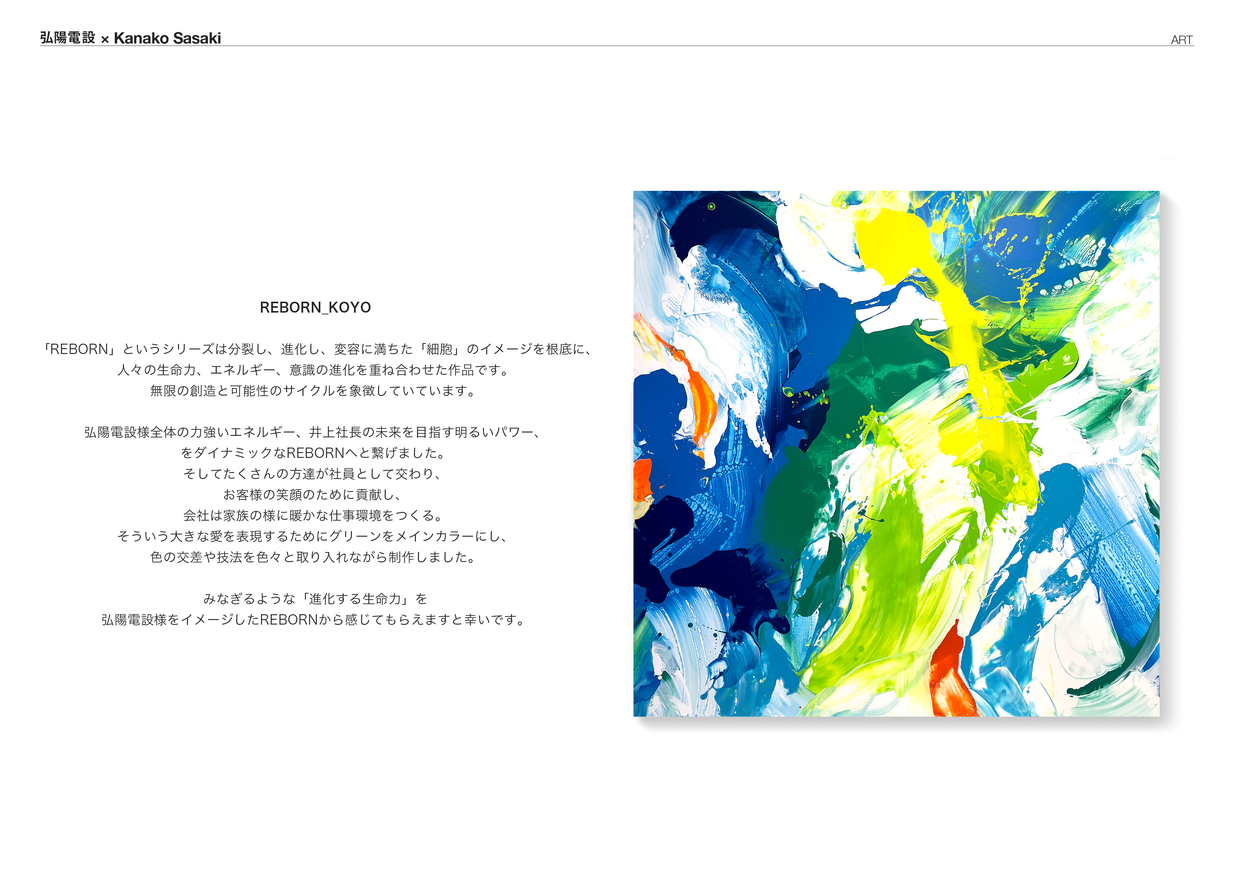 弊社が掲げる理念「みんなの笑顔の為に「快適」「安心」「安全」な社会を」、そして、社員の思いを、 “REBORN_KOYO”として、いま世界的にも活躍するPaint Artist 佐々木 香菜子様に描いていただき、無事に完成の日を迎えることができました。弊社にお立ち寄りの際は、ぜひ、このREBORN_KOYOをご覧いただき、絵が放つパワーを感じ取ってみてください。